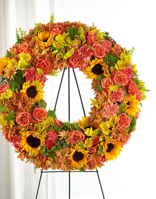 Corona primaveral con girasoles rosas y gerberas