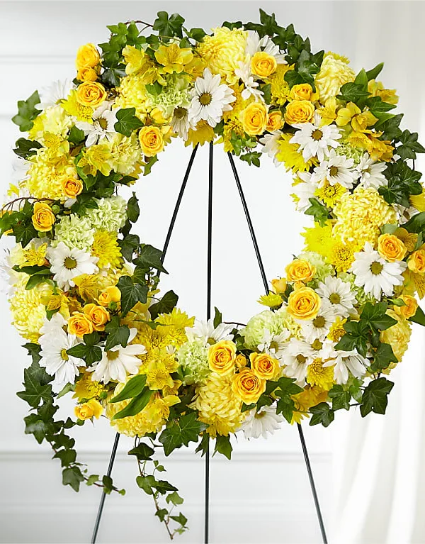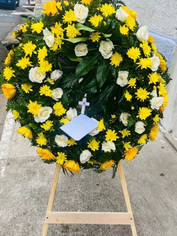 Corona grande con rosas y gerberas amarillo