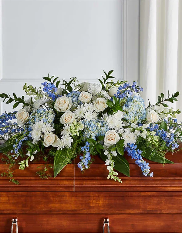 Tributo grande con rosas blancas y detalles azules