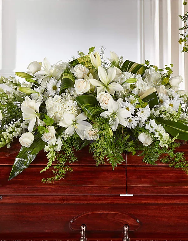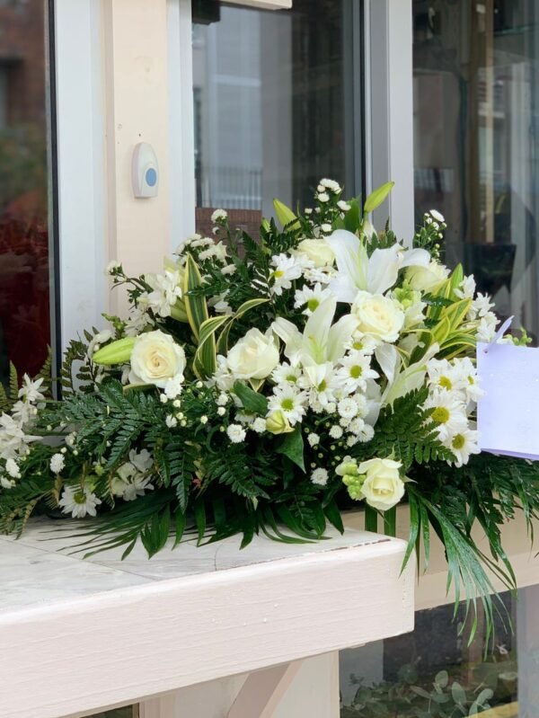 Tributo blanco con rosas y lirios