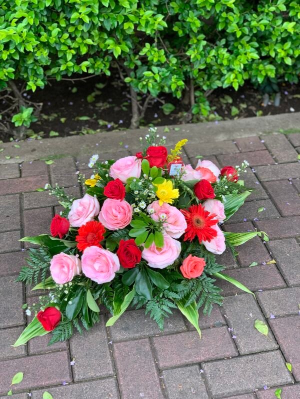 Tributo con rosas de colores y gerberas